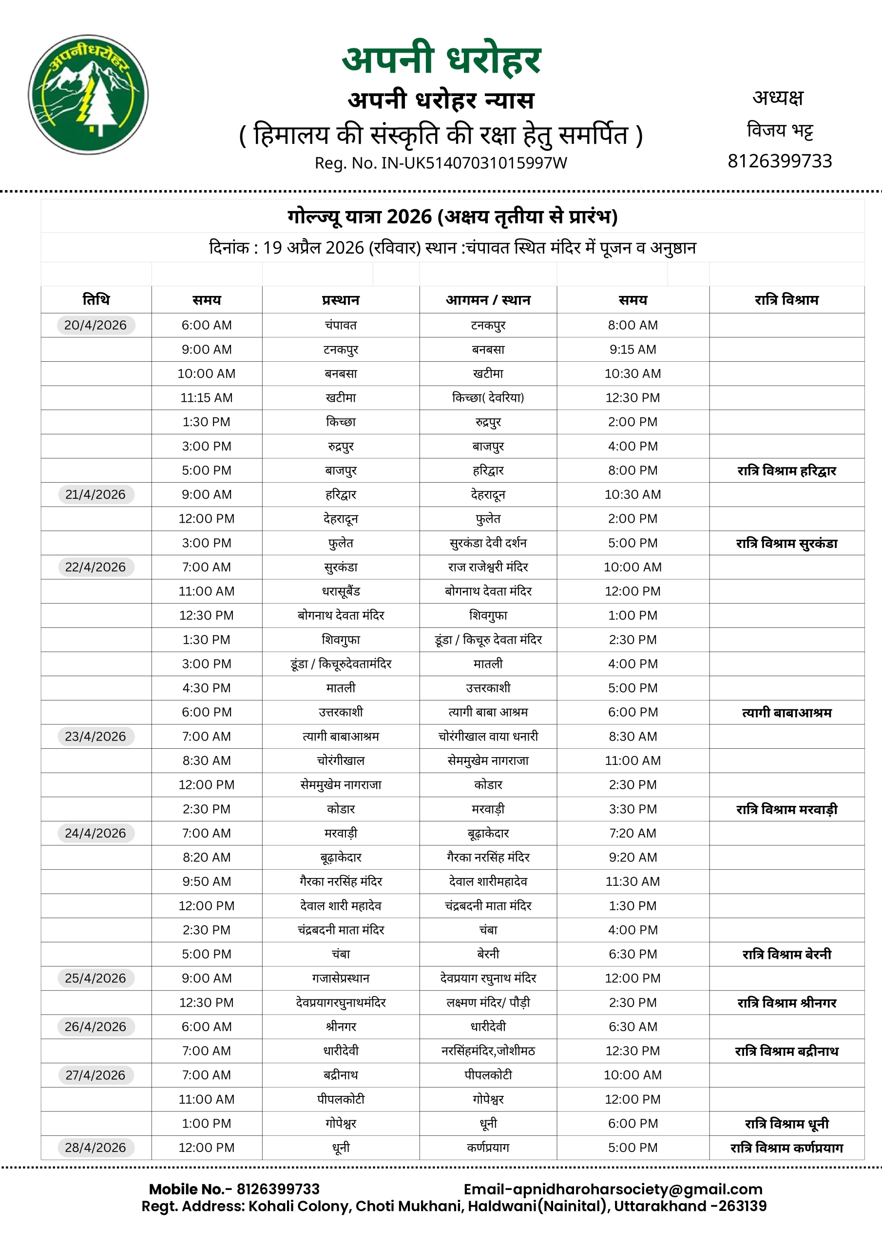 - 4 से 24 नवम्बर 2024: द्वितीय श्री गोल्ज्यू संदेश यात्रा, चंपावत से प्रारंभ।